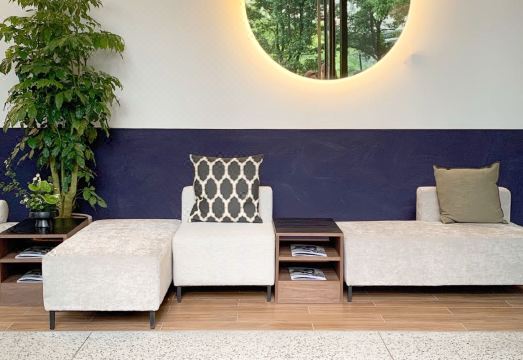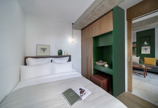 In terms of design, the project showcases exceptional craftsmanship: it not only retains the unique terrazzo material but also breaks away from the monotonous traditional black-white-gray color scheme. Boldly adopting fresh hues of air force blue and postal green, combined with warm log materials and the soft curves of interior walls, it outlines an exquisite, understated yet warm quality of life in every detail.